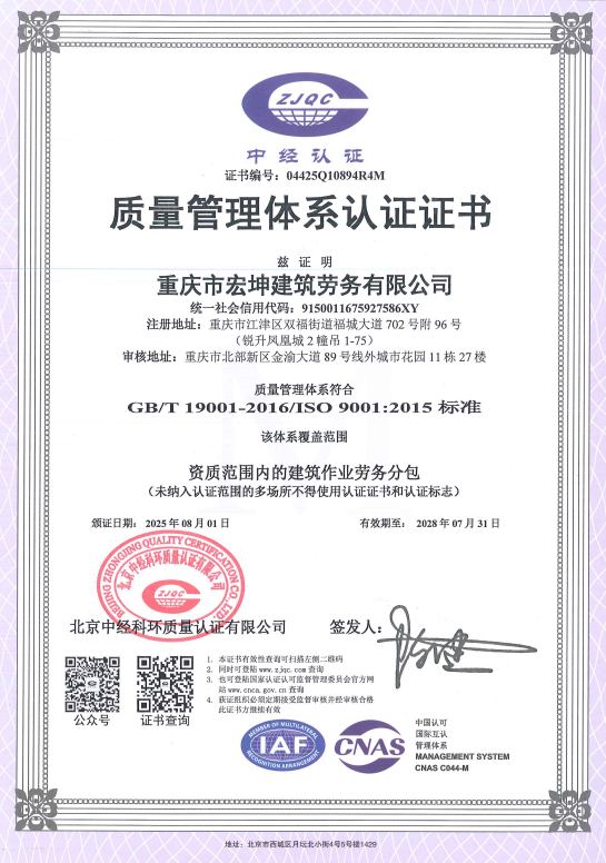 重慶市宏坤建筑勞務有限公司專業從事砌筑、木制、抹灰、鋼筋、混凝土、腳手架、模板、焊接等建筑勞務作業,兼營建筑建材、建筑裝飾材料銷售。